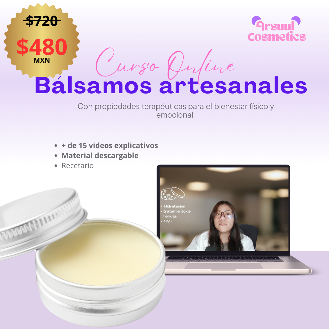 Curso para aprender a crear bálsamos artesanales con ingredientes naturales. Incluye más de 15 videos, material descargable, 3 prácticas guiadas (cólicos menstruales, antiestrés y para artritis/reumas) y una fórmula general para que personalices tus propios bálsamos según tus necesidades.